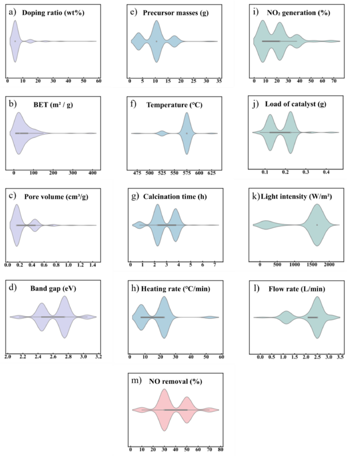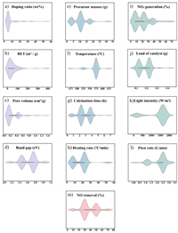 | Fig. 2. Distribution of input features related to (a-d) catalyst characteristics (purple), (e-h) preparation conditions (blue), (i-l) reaction process (green), and (m) target variable (pink). Violin plot is a single-axis plot, and the width of each curve corresponds with the approximate frequency of data points in each region. | |