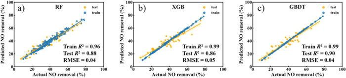 | Fig. 3. Predicted NO removal rate vs actual values with (a) RF, (b) XGB, and (c) GBDT. The three models showed that tree-based models had good prediction performance on the training and test data set. The orange shades represent 95% confidence intervals of the regression line on the test points. | |