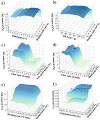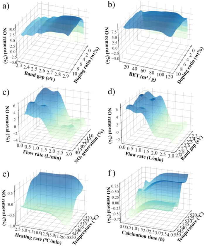 To thoroughly investigate the co-effect of catalyst characteristics, preparation conditions, and reaction process on NO removal rate, the bivariate dependency plots were shown in Fig. 6. Since the BET was linearly correlated with PV in this dataset, the BET was used for bivariate PDP. Bivariate PDP analysis of NO removal on the doping ratio (the most critical factors) and band gap and BET was attempted (Figs. 6a and b). It can be seen that, compared to undoped catalysts, the dependence of NO removal rate is stronger on the catalyst characteristics (band gap and BET) for the doped catalysts. This suggested that the NO removal may be influenced by regulating the band structure and increasing the active site of catalysts due to the interactions between elemental doping and catalyst characteristics (band gap and BET) [54-56].