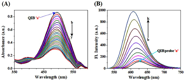An absorption study was performed between the QIB probe (5 µmol/L) and citrate. The probe exhibited the maximum absorption peak at 494 nm (Fig. 1A), which decreased with each addition of citrate (1 µmol/L) up to 24 µmol/L, and the absorption peak fell down at 488 nm.