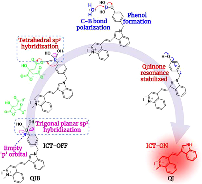 Therefore, a red-emissive fluorophore consisting of methylquinolinium iodide (Q) and indole-phenylboronic acid (IB) was designed to fulfill the above purposes (Scheme 1). Indole was conjugated as a π-spacer between Q and phenylboronic acid, where boronic acid acts as a citrate recognition moiety through a straightforward reaction of a Lewis acid-base sensing mechanism. Afterwards, methylphenol was eliminated and resonance stabilized into a methylquinolinium-indole (QI) product on increasing citrate concentration. The probe secured a large Stokes shift of 134 nm and obtained a lower LOD value of 38 nmol/L (S/N = 3). Citrate was detected quantitatively in prostate tissue to discriminate normal and cancer-affected prostates, which can signal the importance of treatment of PC patients the early stages by virtue of the medical applications. The QIB probe has the properties of being 100% water soluble, with citrate recognition boronic acid, red emission, and quantitative sensing performance in bio-experiments, and it acts as a biochemical reagent in diagnosing PC.
