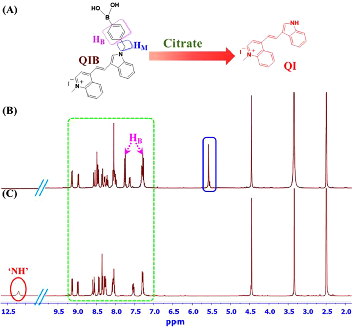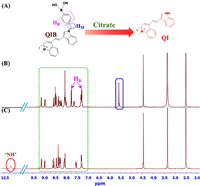 | Fig. 3. (A) Conversion of QIB to QI, 1H NMR spectra of the QIB probe (B) before and (C) after reacting with citrate. | |