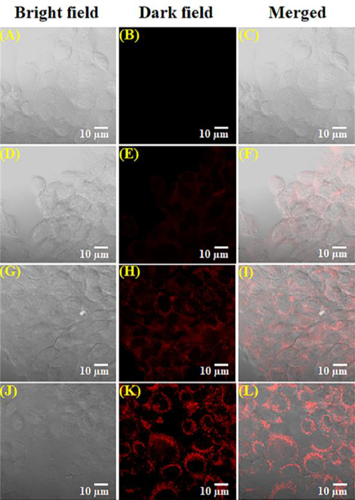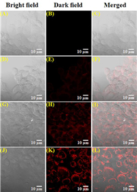 | Fig. 5. Confocal images of PC 3 cells. (A–C) representation of control tests of cells; (D–F) incubated with QIB (2 µmol/L) nearly 30 min. The probe pre-treated cells with citrate (G–I) 2.5 µmol/L and (J–L) 5 µmol/L. | |