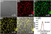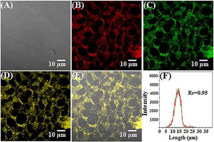 | Fig. 6. Confocal images obtained for (A) QIB-bright-field, (B) probe pre-treated cells reacted with 5 µmol/L citrate, (C) Mito-tracker dye, (D, E) overlapping images, and (F) fluorescence intensities of the red and green interest areas in (B, C). | |