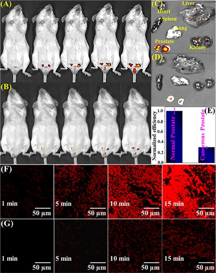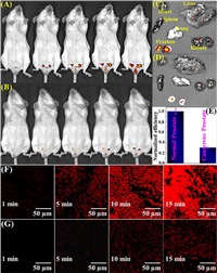 | Fig. 7. Confocal images of Kunming mice administrated tail vein injection of QIB (500 µL, 30 µmol/L) for 0–15 min (A) non-cancerous; (B) prostate cancer. Dissection images of the heart, liver, spleen, lung, kidney, and prostate from mice (C) non-cancerous; (D) prostate cancer. (E) Quantitative evaluation of (C) and (D), reflecting fluorescence efficiency evolved from an area of interest around the prostate. Fluorescence images of resected prostate tissues using QIB (100 µL, 10 µmol/L) for 0–15 min (F) non-cancerous tissues and (G) cancerous tissues (excited at 514 nm; emitted at 535–590 nm). | |