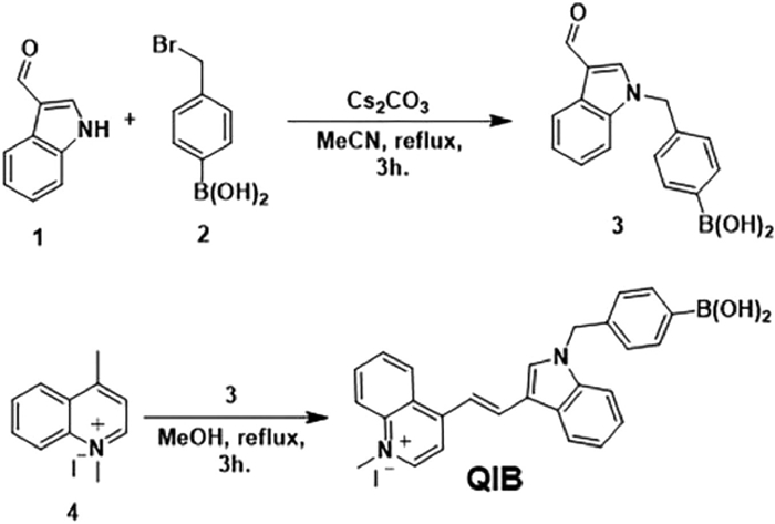 Methylquinolinium iodide (Q) and indole-phenylboronic acid (IB) were synthesized based on previous reports [1,18,19]. The QIB probe was prepared by condensation of Q and IB as shown in Scheme 1, and primary characterizations were carried out using NMR and HR-MS (Figs. S3–S5 in Supporting information).