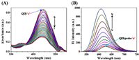 | Fig. 1. UV–vis spectra obtained for 5 µmol/L QIB (a) with each addition of (A) 2 µmol/L citrate ("b to y"). Fluorescence emission responses for 2 µmol/L QIB (a) with each addition of (B) 0.5 µmol/L citrate ("b to k"), excitation at 494 nm. | |