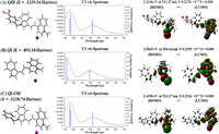 | Fig. 4. Optimized structures and their energies (Hartree) of (A) QIB, (B) QI and (C) QI-OH, their UV–vis absorption spectra, and their molecular orbital shapes related to the electronic transitions corresponding to the main peaks near the 500 nm region. | |