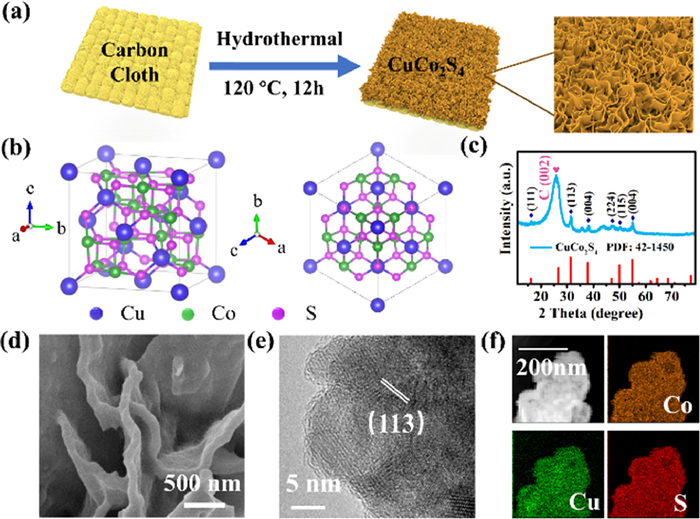 | Fig. 1. (a) Schematic diagram of the synthetic route of CuCo2S4. (b) Two views of the corresponding structure of CuCo2S4. (c) XRD data of CuCo2S4. (d) SEM images of CuCo2S4. (e) TEM of CuCo2S4. (f) STEM-EDS mapping of CuCo2S4. | |