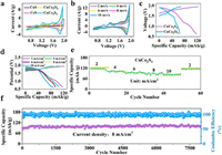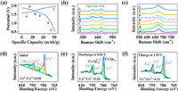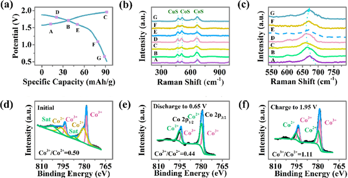 | Fig. 3. Electrochemical and structural transformation of CuCo2S4 during the electrochemical process: (a) The charge/discharge curves for the second cycle at a current density of 8 mA/cm2 in the 2 mol/L KOH aqueous electrolyte along with 0.02 mol/L Zn(CH3COO)2. (b, c) The points A–G mark the states where spectra are performed for Raman analysis, high-resolution XPS spectra of Co 2p for (d) initial, (e) discharge to 0.65 V, and (f) charge to 1.95 V. | |