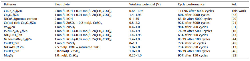 Table 1 Comparison of the key electrochemical performances of some alkaline aqueous zinc batteries. |