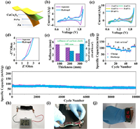 | Fig. 4. Electrochemical performance of rechargeable solid-state zinc batteries. (a) Schematic illustration of the structure of the flexible Zn/CuCo2S4 battery based on PANa hydrogel electrolytes at the scan rate of 5 mV/s. (b) The CV curves of the PANa hydrogel electrolyte and aqueous solution (the 2 mol/L KOH aqueous electrolyte with 0.02 mol/L Zn(CH3COO)2). (c) The CV curves of Zn/CuCo2S4 batteries based on PANa hydrogel at various scan sweeps, (d) The AC impedance spectrum of Zn/CuCo2S4 battery based on PANa hydrogel electrolytes and aqueous solution (the 2 mol/L KOH aqueous electrolyte with 0.02 mol/L Zn(CH3COO)2 (from 10 kHz to 0.01 Hz). (e) Softness and areal energy density of flexible Zn/CuCo2S4 batteries constructed with various thicknesses of cathode materials. (f) The rate performance of the flexible Zn/CuCo2S4 battery. (g) Cycling stability of Zn/CuCo2S4 batteries with PANa hydrogel electrolytes at 8 mA/cm2 (or 16 A/g, loading 0.5 mg/cm2). (h-j) Digital watches powered by flexible Zn batteries. | |