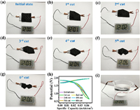| Fig. 5. Cutting test of the flexible Zn/CuCo2S4 battery based on the PANa hydrogel electrolyte. (a) Initial state, (b) after the first cut, (c) after the second cut, (d) after the third cut, (e) after the fourth cut, (f) after the fifth cut, (g) after the sixth cut. (h) The galvanotactic charge/discharge curves of Zn/CuCo2S4 batteries at different cutting status, (i) The flexible Zn/CuCo2S4 battery in freezing test. | |