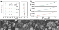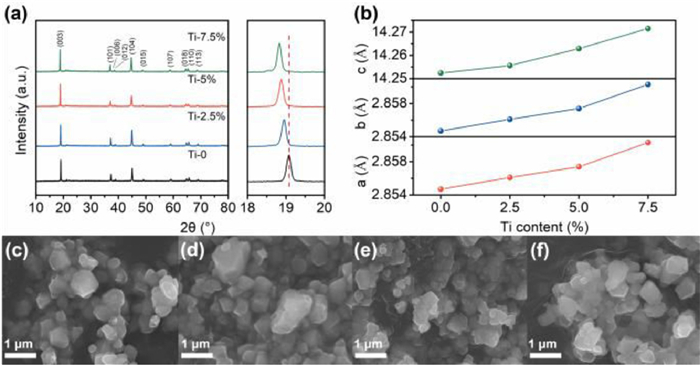 | Fig. 1. (a) XRD patterns and the magnified 2θ range of 18°−20°, and (b) Refined lattice parameters of Ti-0, Ti-2.5%, Ti-5% and Ti-7.5%. The SEM images of (c) Ti-0, (d) Ti-2.5%, (e) Ti-5%, and (f) Ti-7.5%. | |