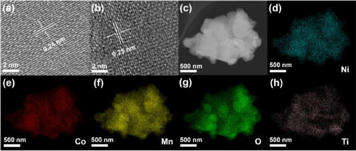 | Fig. 2. The HRTEM images alone the [101] zone axis for (a) Ti-0, and (b) Ti-5%. The low magnification (c) and the mapping of Ni (d), Co (e), Mn (f), O (g) and Ti (h) for Ti-5%. | |
