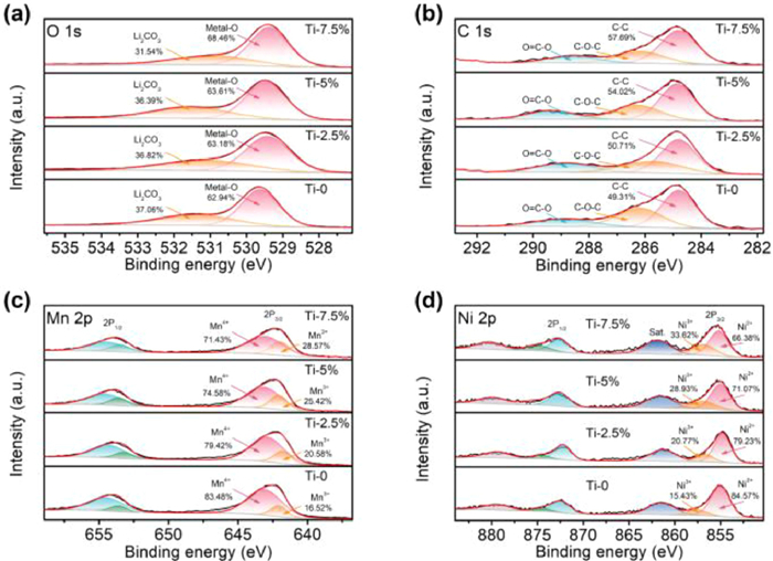 | Fig. 3. High-resolution XPS spectra for (a) O 1s, (b) C 1s, (c) Mn 2p, and (d) Ni 2p of Ti-0, Ti-2.5%, Ti-5% and Ti-7.5%. | |