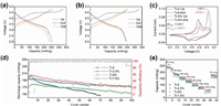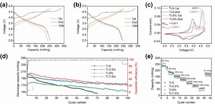 | Fig. 4. The 1st, 2nd and 10th charge-discharge voltage profiles of (a) Ti-0, and (b) Ti-5% at 50 mA/g. (c) CV curves of Ti-0 and Ti-5% in the first two cycles at the scan rate of 0.1 mV/s. The cycling performance (d) at 200 mA/g and rate properties (e) for all samples. | |