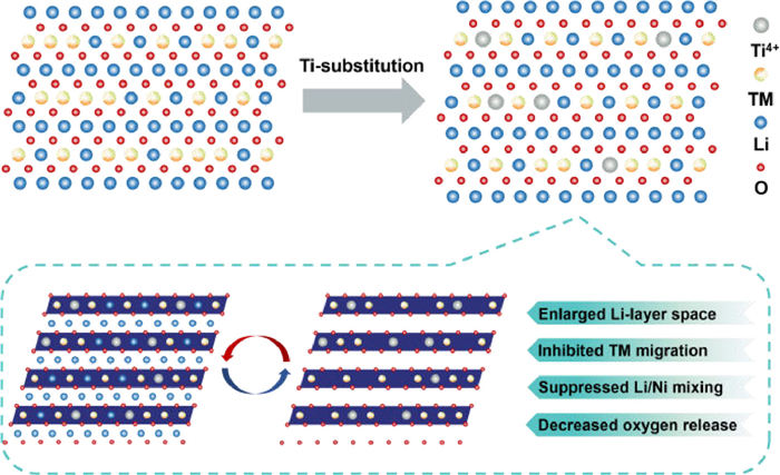 In summary, the Ti-substitution LLMs Li1.2(Mn0.54Ni0.13Co0.13)(1-x)TixO2 (x = 0, 2.5%, 5%, 7.5%) are successfully synthesized by a simple solid-state sintering method. The effects of Ti-substitution on structure stability, inhibition of lattice oxygen release, and improvement of electrochemical performance of LLMs are verified in depth by a series of characterization and test methods. The designed Ti-substitution can expand layer spacing and maintain a stable structure. Moreover, Ti-substitution increases the Ni3+/Ni2+ ratio, inhibits the reduction of Mn4+ in cycling process and mitigates the release of lattice oxygen through the regulation of cations and anions (Fig. 6). The well-ordered layered cathode materials demonstrate a high discharge specific capacity and good capacity retention of 244.2 mAh/g at 50 mA/g and 87.28% after 100 cycles at 200 mA/g, indicating that the appropriate amount of Ti-substitution accelerates the diffusion rate of Li+ and stabilizes the material layered structure, thereby improving the electrochemical performance in LLMs. This study provides a new idea to design a Ti-substitution Li-rich layered cathode materials with an enhanced life span and good reversible capacity retention.