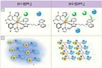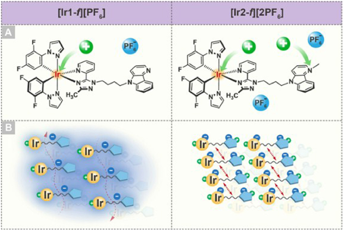 | Fig. 1. (A) Chemical structures of [Ir1-f][PF6] and [Ir2-f][2PF6]. (B) Schematic illustration of molecular packing tuning by changing numbers of counterions. | |