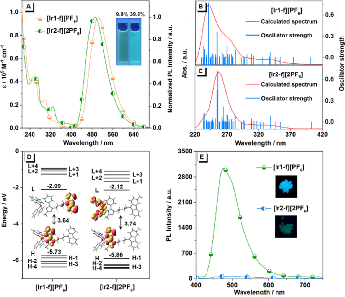 | Fig. 2. (A) Absorption and photoluminescence spectra of [Ir1-f][PF6] and [Ir2-f][2PF6] in CH3CN solution. Inset: photos of two luminogens in CH3CN taken under the illumination of a 365 nm UV lamp. Simulated absorption spectra of complexes (B) [Ir1-f][PF6] and (C) [Ir2-f][2PF6] in CH3CN. (D) Frontier electronic levels and surface distributions of HOMO and LUMO orbitals for complexes [Ir1-f][PF6] and [Ir2-f][2PF6]. H and L denote the HOMO and LUMO, respectively. (E) PL spectra of complexes [Ir1-f][PF6] and [Ir2-f][2PF6] in the solid state. Inset: photos of the two luminogens in the solid state taken under the illumination of a 365 nm UV lamp. | |