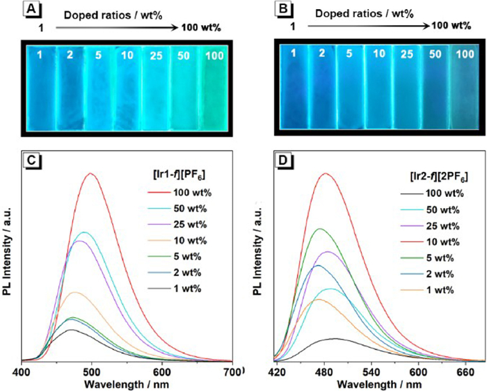 | Fig. 4. Photoluminescence spectra and luminescent photographs of complexes (A, C) [Ir1-f][PF6], and (B, D) [Ir2-f][2PF6] in doped films (1–100 wt% doping concentration, PMMA as the host). | |