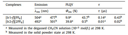 Table 1 Photophysical and electrochemical characteristics for complexes [Ir1-f][PF6] and [Ir2-f][2PF6]. |