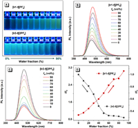 | Fig. 3. (A) Luminescent photographs of solutions or suspensions of [Ir1-f][PF6] and [Ir2-f][2PF6] in water/CH3CN mixtures with different fractions of water (fw), with [Ir1-f][PF6] and [Ir2-f][2PF6] showing typical AIE and ACQ effects, respectively. Emission spectra of (B) [Ir1-f][PF6] and (C) [Ir2-f][2PF6] in water/CH3CN mixtures (0–90%). (D) Plot of maximum emission intensity of [Ir1-f][PF6] an d [Ir2-f][2PF6] versus water fraction. | |