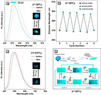 | Fig. 5. Emission spectra of (A) [Ir1-f][PF6] and (C) [Ir2-f][2PF6] before and after grinding. (B) The repeated cycles of the grinding and recovery processes for complex [Ir1-f][PF6]. (D) A reversibly rewritable data recording device based on complex [Ir1-f][PF6]. | |