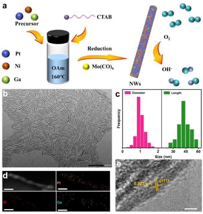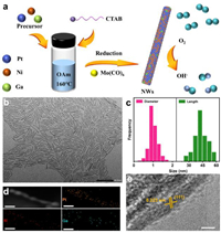 | Fig. 1. (a) Scheme of the fabrication process for PtNiGa NWs and the catalysis mechanism in the oxygen reduction reaction. Structural and compositional characterizations of PtNiGa NWs: (b) TEM images. (c) Histogram of diameter and length distributions. (d) EDS elemental mapping images of Pt, Ni and Ga. (e) HRTEM images. Scale bars: (b) 50 nm, (d) 5 nm, (e) 2 nm. | |