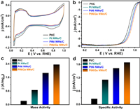 | Fig. 3. Electrocatalytic performance of different catalysts. (a) Cyclic voltammograms of recorded in Ar-saturated 0.1 mol/L HClO4 solution with a scan rate of 50 mV/s at room temperature. (b) Positive-going polarization curves recorded in O2-saturated 0.1 mol/L HClO4 solutions with a sweep rate of 20 mV/s and a rotation rate of 1600 rpm. (c) Mass activities at 0.9 V vs. RHE. (d) Specific activities at 0.9 V vs. RHE for Pt/C, Pt NWs/C, PtNi NWs/C and PtNiGa NWs/C. | |