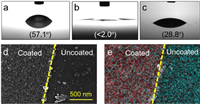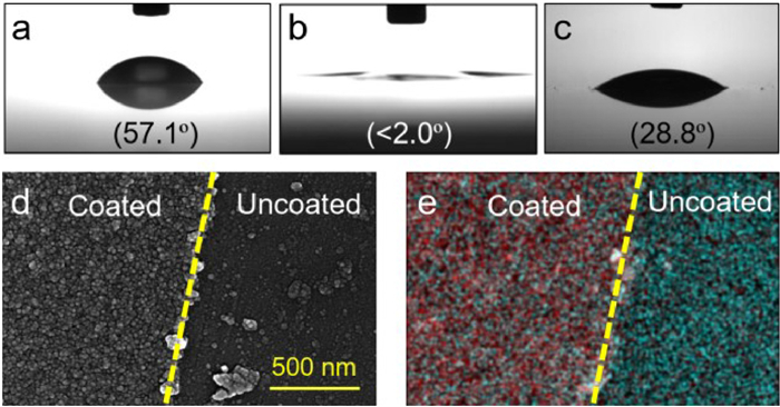 | Fig. 2. CA values of PC-C films synthesized with different pH levels: pH 2–3 (a), pH 7 (b) and pH 9–10 (c). SEM image (d) and mapping analysis (e) of the high-pressure spraying coated and uncoated PC-C film on substrates, elements distribution, Ti: red, O: cyan. | |