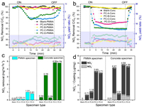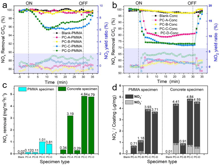 | Fig. 3. Photocatalytic activity of NOx removal of the coated PMMA (a) and concrete (b) specimen under simulated solar light (NO as the initial gas). Specific NOx removal rate of coated specimen (c). NOx-to-NO2− ratio and NOx-to-NO3− ratio of the coated specimen (d). | |