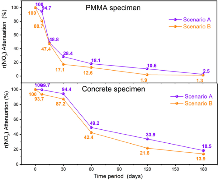 | Fig. 4. Attenuation rate of r(NOx) in PC-C-PMMA and PC-C-Concrete specimen over a 180-day exposure time. | |