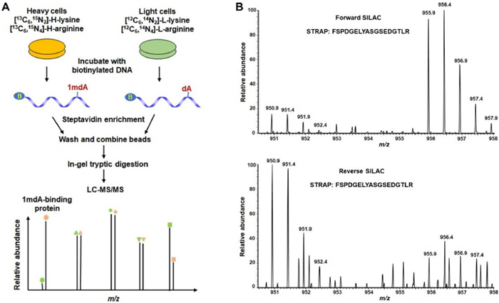 | Fig. 1. Identification of 1mdA-binding proteins in human cells. (A) Schematic overview of the SILAC-based quantitative proteomics strategy for uncovering 1mdA-binding proteins (forward SILAC). (B) Representative ESI-MS data for the [M + 2H]2+ ions of a tryptic peptide FSPDGELYASGSEDGTLR from STRAP, revealing the preferential binding of STRAP towards 1mdA-carrying DNA in both forward and reverse SILAC experiments. "B" in Fig. 1A represents biotin. | |
