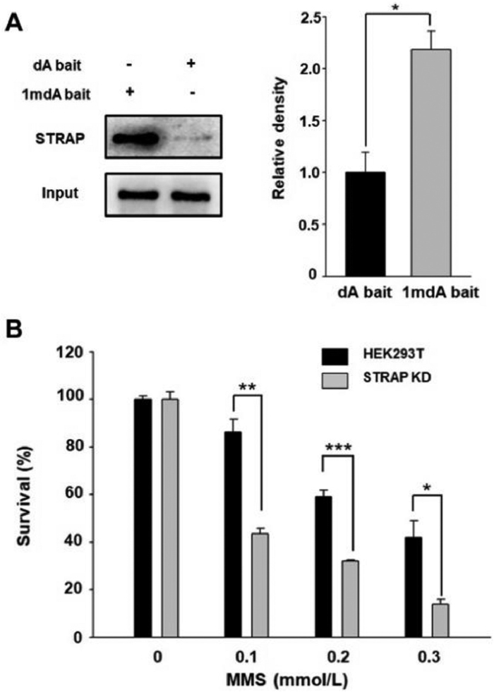To further confirm the interaction between STRAP and 1mdA in DNA, we expressed Glutathione S-transferase (GST)-tagged recombinant STRAP protein and performed in vitro pulldown assay. In this vein, equal amount of biotinylated 1mdA- and dA-bearing DNA probes were incubated with STRAP protein, followed by straptavidin enrichment and western blot analysis. As shown in Fig. 2A, the results showed that STRAP binds more strongly to 1mdA-carrying probe than the corresponding control probe, which is consistent with our data from the above LC-MS/MS experiments (Fig. 1B and Fig. S2 in Supporting information). Although we cannot exclude the possibility that there might be false-positive pull-down signals, the much weaker binding of STARP with the unmodified control probe than with 1mdA-bearing probe indicating that STARP is a 1mdA-binding protein.