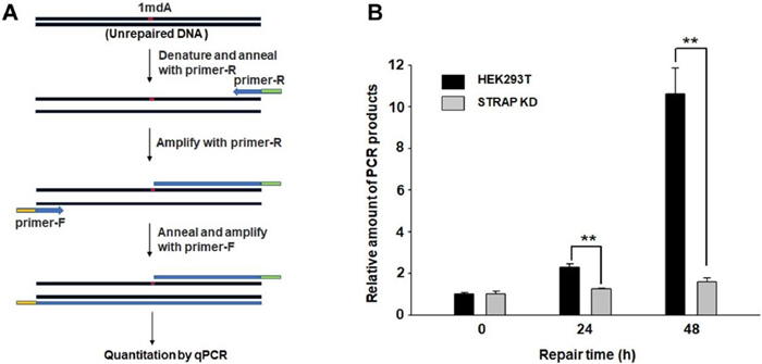 | Fig. 3. STRAP promotes the repair of 1mdA in DNA. (A) Quantitative PCR-based repair analysis of 1mdA-bearing DNA in extracts from wild-type and STRAP-knockdown (STRAP KD) HEK293T cells. (B) Quantification data of in vitro 1mdA repair assay. The data represent mean±SEM (n = 3). ** P < 0.01. The P values were calculated using unpaired two-tailed Student's t-test. | |