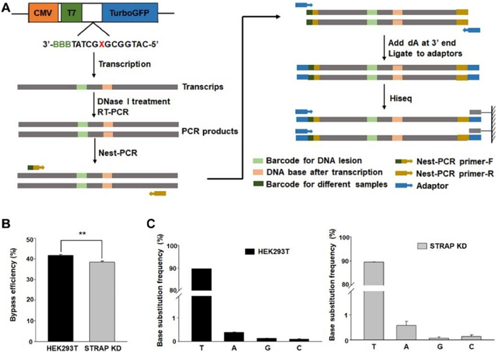 | Fig. 4. STRAP is involved in the transcriptional bypass of 1mdA in DNA of human cells. (A) The workflow of next-generation sequencing (NGS)-based transcription assay. "X" and "BBB" represent 1mdA and barcode, respectively. Transcriptional bypass efficiencies (B) and base substitution frequencies (C) of 1mdA in wild-type and STRAP-knockdown (STRAP KD) HEK293T cells. The data represent mean±SEM (n = 3). ** P < 0.01. | |