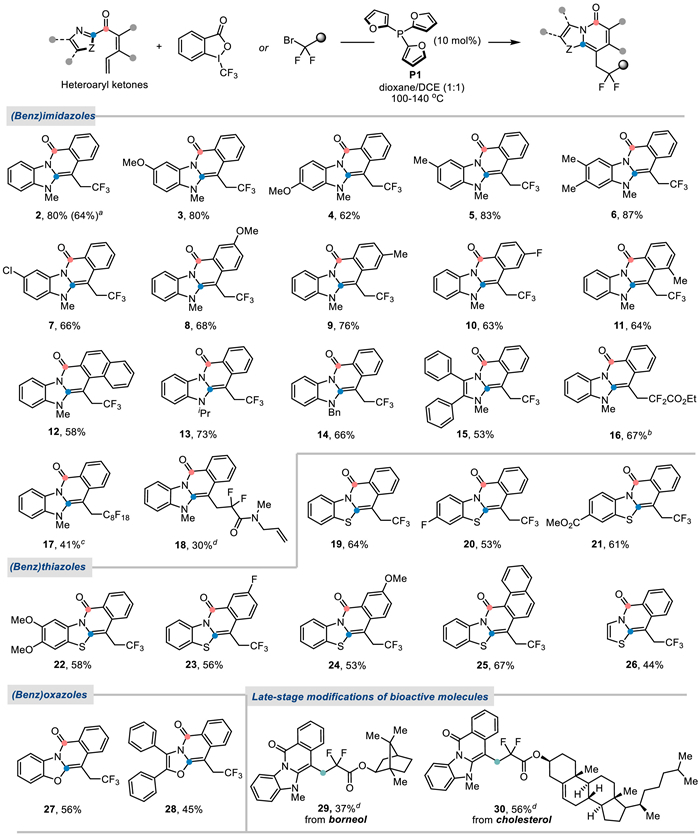 | Scheme 1. Substrate scope for preparing N-fused heterocycles. Reaction conditions: ketones (0.1 mmol) and Togni's reagent Ⅱ (0.15 mmol, 1.5 equiv.), with 10 mol% tri(2-furyl)phosphine (TFP), in dioxane/DCE (0.6 mL, 1:1) at 100 ℃ for 24 h, and 140 ℃ for 12 h. Isolated yields after chromatography. a The yield for large-scale synthesis with 1.5 mmol of 1. b Using ethyl bromodifluoroacetate (0.15 mmol, 1.5 equiv.) instead of Togni's reagent Ⅱ at 140 ℃ for 36 h. c Using perfluoroalkyl iodide (0.15 mmol, 1.5 equiv.) instead of Togni's reagent Ⅱ at 140 ℃ for 36 h. d Using perfluoroalkyl amide or bromodifluoroacetate instead of Togni's reagent Ⅱ at 140 ℃ for 48 h. | |