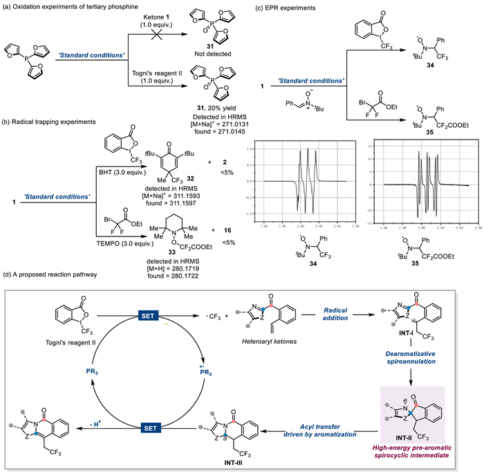 A series of control experiments were performed to investigate the mechanism of the phosphine-catalyzed radical-mediated process. When TFP was used with Togni's reagent Ⅱ and heteroaryl ketone 1 in a 1:1 ratio at standard conditions and an electrospray ionization mass spectroscopic analysis was performed, it revealed that only tri(furan-2-yl)phosphine oxide 31 was detected in the presence of Togni's reagent Ⅱ (Scheme 2a). This suggests that only Togni's reagent Ⅱ can oxidize tertiary phosphine to initiate the generation of CF3 radicals. Furthermore, a radical inhibition analysis validated the generation of a radial intermediate in the phosphine-initiated SET process (Scheme 2b), which was also confirmed by an electron paramagnetic resonance (EPR) analysis of the reaction between polyfluoroalkyl radicals 34 and 35 (Scheme 2c). The proposed reaction pathway based on the results described above and in previous studies is shown in Scheme 2d. Initially, the use of phosphine as a SET reagent under the oxidation of Togni's reagent Ⅱ generated the corresponding phosphorus radical cation and CF3 radical. The CF3 radical attacks the alkene of heteroaryl ketones, affording a nascent benzyl radical intermediate, INT-Ⅰ, followed by the dearomatizative spirocyclization to form spiro-N-radical INT-Ⅱ. The aromatization driven intramolecular acyl transfer of the high-energy intermediate INT-Ⅱ facilitates the formation of stable INT-Ⅲ. Subsequently, single-electron oxidation of the phosphorus radical cation and deprotonation occurred to yield N-fused heteroarenes and regenerate the catalyst.