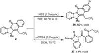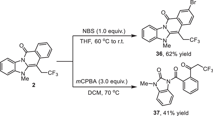 Further studies were conducted to investigate the synthetic utility of N-fused heteroarenes (Scheme 3). The bromination of 2 proceeded smoothly to afford 36 in presence of N-bromosuccimide (NBS), which allows follow-up fused heterocycle manipulations through cross-couplings. And a deconstruction of N-fused heterocycle was observed when treated 2 with mCPBA, affording 37 in 41% yield [9].