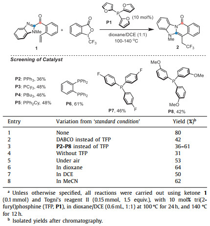 To explore this strategy, we initiated a systematic study of the reaction conditions using heteroaryl ketone 1 as a model substrate. The desired trifluoromethyl modified product 2 was isolated in 80% yield using tri(2-furyl)phosphine (TFP, P1) and Togni's reagent Ⅱ via phosphine-oxidant charge transfer in dioxane/1,2-dichloroethane (DCE). A control experiment revealed that TFP appears to be critical in this reaction. Tertiary amine DABCO and other phosphines (Table 1, entries 2 and 3), such as tributylphosphine (P4) and 1,2-bis(diphenylphosphino)benzene (dppBz, P6), were not as effective, and only 31% yield of the product could be observed in the absence of tri(2-furyl)phosphine (Table 1, entry 4), which might be attributed that an electron donor-acceptor (EDA) complex was formed between N-containing heteroaryl ketones (donor) and Togni's reagent Ⅱ (acceptor) to generate the CF3 radical [51]. The reaction was not sensitive to oxygen and was promoted smoothly under normal air conditions, although a slightly higher yield was obtained under a N2 atmosphere (Table 1, entry 5). A survey of different solvents revealed that the individual DCE, dioxane, and MeCN could also give acceptable yields, although lower than that of the mixture (Table 1, entries 6–8). The study of ·CF3 sources further suggested that oxidant capacity is essential for the SET process [52], other trifluoromethylation reagents such as Togni's reagent I, Umemoto's reagent and trifluoromethyl thianthrenium triflate were not effective in this process, and only Togni's reagent Ⅱ is a compatible oxidant that generates phosphinium radical cations and free trifluoromethylcarbon radicals.