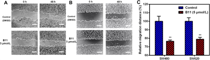 | Fig. 1. The 48 h wound-healing assay of colorectal cancer cells at 5 µmol/L of B11. (A) SW480 cells; (B) SW620 cells. Scale bar: 50 µm. (C) The relative migration distance of SW480 cells or SW620 cells in A or B. All data were shown as mean ± standard deviation (SD), n = 2. **P < 0.01 vs. control. | |