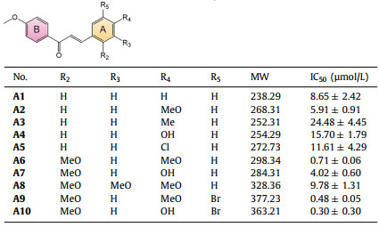 Table 1 Chemical structures of A-series chalcone analogues and their anti-Notum activities. |