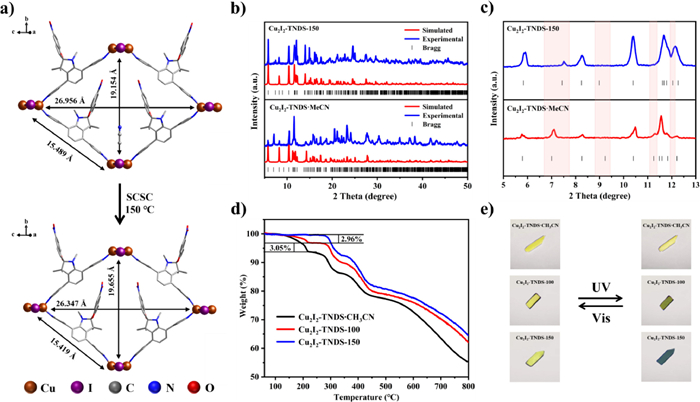 | Fig. 1. (a) The SCSC phase transition progress of Cu2I2-TNDS∙CH3CN. (b, c) PXRD patterns of Cu2I2-TNDS∙CH3CN and Cu2I2-TNDS-150. (d) TGA curves for Cu2I2-TNDS∙CH3CN, −100, and −150. (e) Color changes of Cu2I2-TNDS∙CH3CN, −100 and −150 after UV irradiation. | |