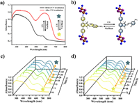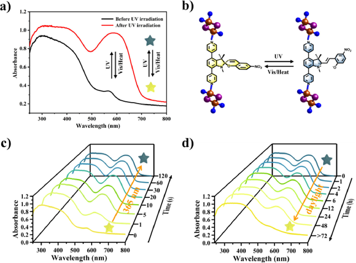| Fig. 2. (a) UV-vis absorption of Cu2I2-TNDS-150 powders before and after UV irradiation. (b) Reversible structural isomerization between SP and MC form in Cu2I2-TNDS-150 under different stimuli. Time-dependent UV–vis absorption spectra of Cu2I2-TNDS-150 powders (c) under 365 nm UV irradiation and (d) in daylight environment. | |