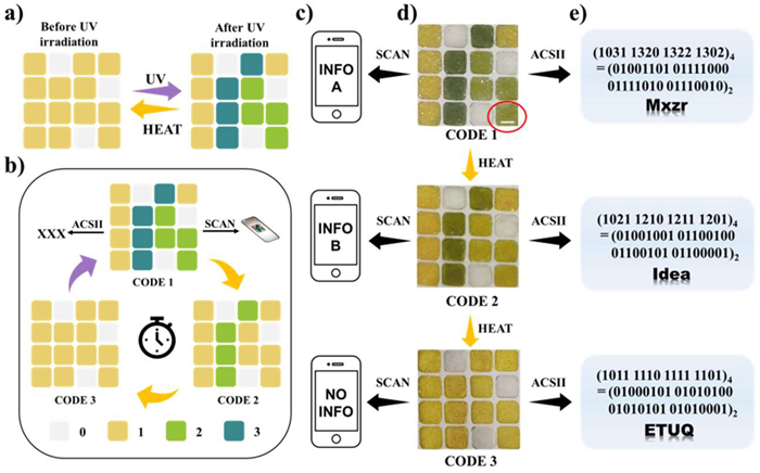 | Fig. 3. (a) Schematic illustration of the 3D color code before and after UV irradiation. Yellow: Cu2I2-TNDS·CH3CN; Yellow-green: Cu2I2-TNDS-100; Blue-green: Cu2I2-TNDS-150 in the 4 × 4 matrix after UV irradiation. (b) Schematic representations and (d) visible pictures of the 4 × 4 matrix on a time scale under the heating stimulus. White, yellow, yellow-green, and blue-green units represent the quaternary codes of "0", "1", "2", and "3", respectively (scale bar: 3 mm). (c) The corresponding information of 3D code was read using a smartphone. (e) Decoding of "Mxzr", "Idea" and "ETUQ" from the code at different heating times. | |