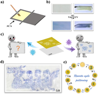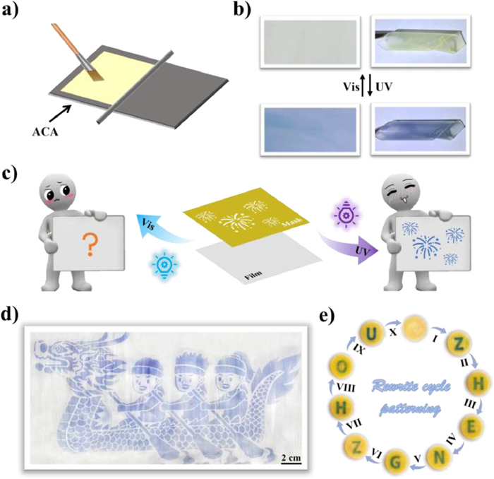 | Fig. 4. (a) Schematic illustration of the process of the 150-coated film. (b) Before and after UV irradiation of the 150-coated film attached to a piece of paper or a flexible 150-coated film. (c) Diagram illustrations of the photomask printing processes. (d) The patterning application of the 150-coated film. (e) The records of the writing and erasing processes. (Ⅰ) UV irradiation on Mask 1; (Ⅱ-Ⅸ) Erasure by heating, then UV irradiation on different Masks 2–9; (X) Erasure by heating. | |
