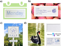 | Fig. 5. The application of 150-coated film in short-term reusable-display: (a) Temporary calendar. (b) Short-term price-card for supermarket. (c) Billboards with information displays. (d) Short-term ID card images. | |