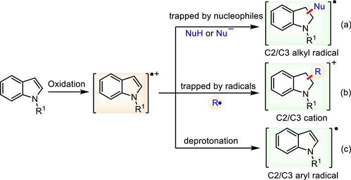 | Scheme 1. Three transformation modes of indole radical cations. | |