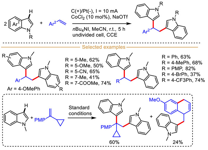 In 2021, Li et al. disclosed a cobalt-promoted electrocatalytic indole-derived radical cation-mediated 1,2-diarylation of olefins with indoles and other electron-rich aromatic hydrocarbons using graphite rod as anode and platinum plate as cathode in an undivided cell (Scheme 10) [68]. The key to success relied on the combination of NaOTf and nBu4NI as the electrolyte system to promote the formation of key indolyl carbon-centered radical, otherwise the reaction efficiency was extremely low or even the reaction did not proceed. This diarylation project featured broad substrate compatibility and excellent functional group tolerance under mild conditions. Specifically, the transformation of 1-methyl-1H-indole with 1-(1-cyclopropylvinyl)-4-methoxybenzene was performed under standard conditions, the diarylated product and ring-opening product were obtained in 60% and 24% yields, respectively, which suggested that a benzyl radical was involved in this protocol.